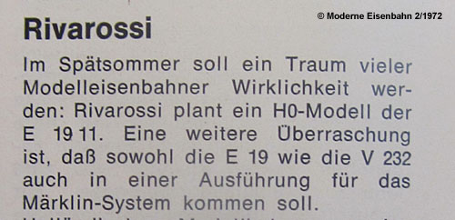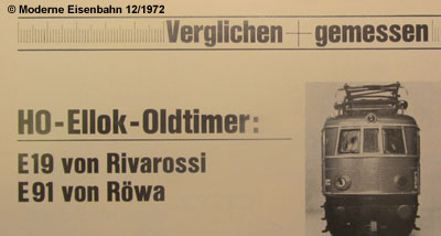 Im Jahr 1972 prĂ€sentierte die âModerne Eisenbahnâ auch erstmals seinen Lesern die Wahl zum Modell des Jahres. Bei den H0-Triebfahrzeugen in GroĂserie war auch die Rivarossi E19 als Kandidat dabei und durfte sich der Lesergunst stellen. Die Konkurrenten waren MĂ€rklin S3/6, Fleischmann 064, Trix 92 und Röwa E91. Die Rivarossi E19 konnte damals aber nur den 4. Platz vor der Trix 92er erreichen. |