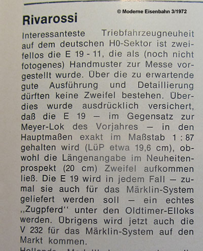 Allerdings wurde bemĂ€ngelt, dass die Beleuchtung der Frontlampen bei langsamer Fahrt deutlich zu schwach war. Die Herstellerschilder waren etwas zu groĂ. DafĂŒr wurde besonders darauf hingewiesen, dass âals besonderer Gagâ ein Satz messingfarbener Reichsbahnadler (mit dem komischen Kreuz) beigelegt worden war, welcher je nach Einsatzepoche aufgebracht werden konnte. Im Gesamteindruck wurde zum Ausdruck gebracht, dass die Rivarossi maĂstĂ€blich und weitgehend detailgetreu gefertigt wurde und damit Rivarossi erstmals der entscheidende Durchbruch in der Klasse der Spitzenmodelle nach deutschen Vorbildern gelungen sein dĂŒrfte. Eine Tabelle der MaĂstĂ€blichkeit zum Vorbild ergab bei der Rivarossi E19 fast durchgehend sehr gute Werte. So ist das Modell in der LĂ€nge gerade einmal 1,4 mm zu lang, was selbst heute noch zu vernachlĂ€ssigen ist. In der Höhe, dem Treibachsstand und dem Gesamtachsstand waren die Werte sogar exakt. Ein kleiner Ausrutscher war allerdings die Breite des Modells, denn die war im Vergleich zum Vorbild um 1,6 mm zu breit. Es ist aber nicht zutreffend, wie immer wieder behauptet wird, dass die Rivarossi E19 im MaĂstab 1/82 oder 1/85 gefertigt wurde. Lediglich in der Breite stimmt das Modell nicht ganz. Im Bericht wurde auch schon darauf hingewiesen, dass Anfang des nĂ€chsten Jahres (1973) die E19 auch in blau und grĂŒn erscheinen soll. |