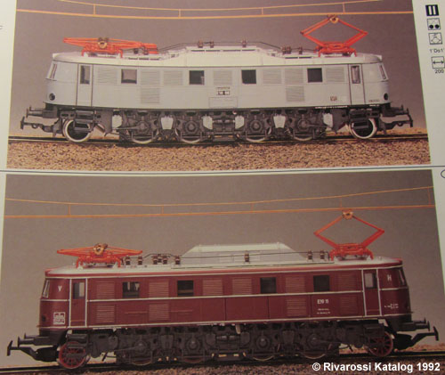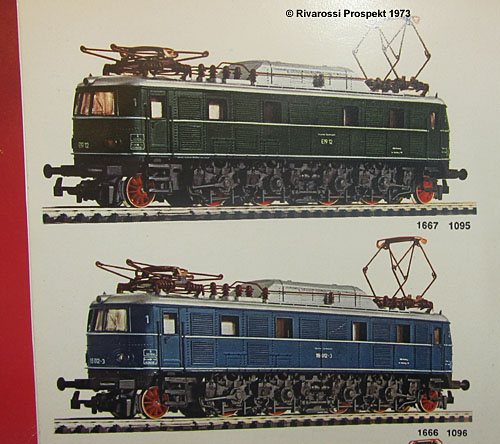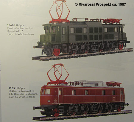 Im Jahr 1974 wurde bei der NĂŒrnberger Messe ein Handmuster der Rivarossi E17 gezeigt. Danach war hier laut Messebericht ein Spitzenmodell zu erwarten, aber es wurde bereits auch ausgesagt, dass es bis zur Auslieferung noch einige Zeit dauern wĂŒrde. So war es auch, denn erst bei der Messe 1975 wurde dann die âfertigeâ E17 prĂ€sentiert. Bereits das abgebildete Muster trug ĂŒbrigens die Betriebsnummer 117 121-4 der Epoche IV. Die Lok war damals die interessanteste Rivarossi Neuheit fĂŒr den H0-Bahner. Aufgebaut war das Modell auf dem Fahrgestell der E19. Auch hier wurde im Messebericht des Eisenbahn Magazins wieder auf eine gute Detaillierung hingewiesen. Die Preise jedoch waren erneut gestiegen. So war die E17 fĂŒr 120,-- DM (ca. 61,-- EUR) in Gleichstrom, bzw. 154,-- DM (ca. 79,-- EUR) in Wechselstrom im Angebot. Hierzu gab es im Eisenbahn Magazin 3/1975 noch einen interessanten Hinweis. So sei laut Firmenangaben dieser Preis nur möglich, indem man eben auf das Fahrgestell der E19 zurĂŒckgegriffen habe. Ansonsten wĂ€re bei einer Neuentwicklung der Preis an die 200,-- DM Grenze (fĂŒr Gleichstrom) geklettert. So wurde die E17 eben einige Millimeter zu lang, aber die Proportionen wirkten vorbildgerecht und es waren auch eingesetzte Fenster vorhanden. Schon direkt nach der Messe war die 117 im Handel zu erhalten. Zu dem Thema, dass bei der E17 das Fahrgestell der E19 verwendet wurde (und auch bei der folgenden E18) und dies leider ein durchaus störender Fehler war, gibt es noch Infos auf der Seite âDetailsâ. |