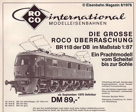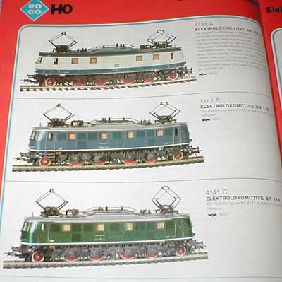 Diese drei Versionen der 118 erschienen dann auch im Katalog 1978. Die erste (weit verbreitete) Auflage dieser drei Modelle trugen noch die leider deutlich sichtbaren Aussparungen in der Gehäuseseitenwand für die Rastnocken. Später, wohl bereits ab 1978, wurden diese Löcher dann verschlossen, was optisch eine deutliche Verbesserung war. Dabei wurde auch die Farbe der Inneneinrichtung von einem Hellbeige in ein Hellbraun verändert, die Farbgebung wurde vorbildgetreuer (besonders die blaue und grüne 118 waren zuerst deutlich dunkler) und die Dachtritte wurden nun auch dunkler eingefärbt. Die Modelle wurden auch in Wechselstrom als Neuheit für das Jahr 1978 angekündigt. Jedoch, wie auch bei anderen Modellen, kam es (noch) zu keiner Produktion für die Wechselstrombahner. Bereits im Katalog 1980/81 war die beige/türkise Version verschwunden und die grüne Variante war “derzeit ab Werk nicht lieferbar”. Sie kam aber nochmals ab 1982/83 in das Programm als lieferbares Modell. Zwar wurde hier erneut die Lok mit der Nummer 118 051-2 abgebildet, ich gehe aber davon aus, dass diese neue Auflage dann tatsächlich mit der Betriebsnummer 118 038-9 erschienen ist und ein aufgehelltes Grün erhalten hatte. Was man aber zu beiden grünen Versionen ergänzend muss ist, dass weder die 051 noch die 038 beim Vorbild in grün mit Tütenlampen und Computernummer gefahren sind. Aber ganz so genau nahm man es damals nicht. Im Katalog 1983/84 wurde die blaue Version mit einer neuen Betriebsnummer (118 010-8) angeboten. Die Federkupplung als Antrieb blieb bei dieser ganzen Serie aber erhalten. Das Blau war nun bedeutend heller und wirkte dadurch vorbildlicher. Schon ab dem nächsten Roco Hauptkatalog wurde das Modell als 118 005-8 beschrieben, wenn auch noch die 118 010-8 abgebildet war. |