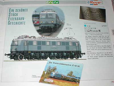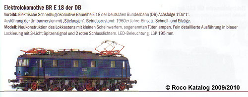 Das Gute kann man immer noch besser machen. So dachte wohl auch Roco und brachte im Neuheitenprospekt 2009 wieder eine E18 der DB. Dabei wurde vermerkt, dass es sich um ein überarbeitetes Modell handeln wird, mit vorbildgerechten Stielaugenlampen und LED-Beleuchtung. Abgebildet wurde ein Vorbildfoto der blauen E18 049. Auch die Ausführung in Epoche III wurde vermerkt. Das Modell wurde in Gleichstrom (62630) und Wechselstrom (68630) angekündigt und es wurden als unverbindliche Preisempfehlungen 164,00 EUR, bzw. 204,00 EUR genannt. |
