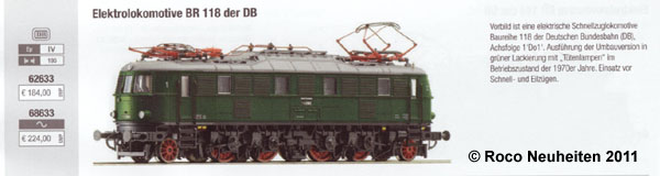 In dieser Form war die grüne 118 auch im Katalog 2011/2012 zu finden. Auch da gab es noch keine Angabe zur Betriebsnummer und auf dem Modellfoto war diese unkenntlich gemacht worden. Sie erschien dann als 118 044-7. Dies war dann jedoch die einzige E18/118, die im Katalog zu finden war. Sowohl die blaue 118 029-8 (62631/68631), wie auch die beige/türkise 118 013-2 (62632/68632) waren nach kürzester Zeit nicht mehr im Angebot. Der Neuheitenkatalog von 2012 und auch von 2013 sah dann keine weitere Ergänzung der 118er Flotte vor. Im Hauptkatalog 2013 war schließlich die 118 044-7 nicht mehr enthalten. |