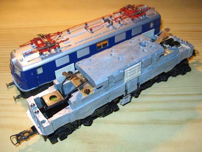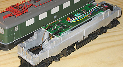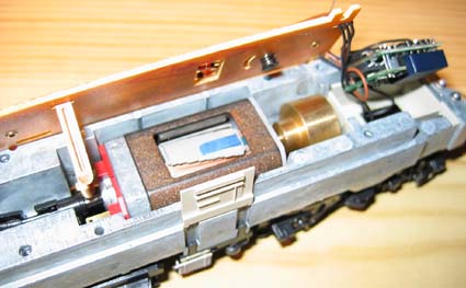 Das Öffnen der Lok ist unspektakulär. Jeweils auf Höhe der inneren Achsen sind die Rastnocken zu finden. Ein Auseinanderziehen des Gehäuses an dieser Stelle, verbunden mit einem leichten Schütteln, trennt das Fahrgestell vom Gehäuse. Im Inneren verbirgt sich bei den ersten Ausführungen ohne die digitale Schnittstelle ein massiver Metallrahmen mit zusätzlich aufgesetztem Metallgewicht über der Platine. |