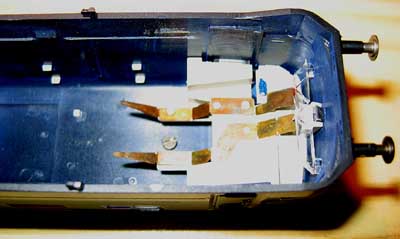 Die Stromverbindungen zwischen den Stromabnehmern und der Platine übernehmen federnde Kupferbleche. Hier gibt es aber einen Unterschied. Bei der Ausführung ohne die digitale Schnittstelle sitzen die Federbleche auf der Platine und berühren nach dem Aufsetzen des Gehäuses die Befestigungsschrauben der Stromabnehmer. Bei der Ausführung mit der digitalen Schnittstelle sind die Federbleche an der Befestigungsschraube angebracht (dort erhielt das Gehäuse klein Führungsgrate) und berühren dann den Kontaktstift auf der Platine. Das ist nicht schlimm, nur sollte man es bei einem Hütchentausch wissen, dass man die Federbleche noch umbauen muss. Auch die Stirnlampen werden über solche Federbleche angeschlossen, die aber bei beiden Platinenausführungen am Gehäuse angebracht wurden. Beim Wiederaufsetzen des Gehäuses ist immer ein wenig Vorsicht geboten, damit diese Kontakte nicht verbogen werden. Durch diese Technik können für Front und Schlußbeleuchtung getrennte Microlämpchen verwendet werden, die leicht auszutauschen sind. Aber wenn das Gehäuse geöffnet wurde, dann “bitte nicht stürzen”, denn die Microlämpchen haben sonst keine Fixierung und fallen aus ihren Einbaulöchern. Und wenn es passiert ist...die weiße Birne gehört mittig eingesetzt. |