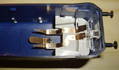 Links der Blick in das Gehäuse der Ausführung ohne DSS und rechts in die Lok mit DSS. Man sieht rechts das zusätzliche Kontaktblech an der Befestigungsschraube des Stromabnehmers. |