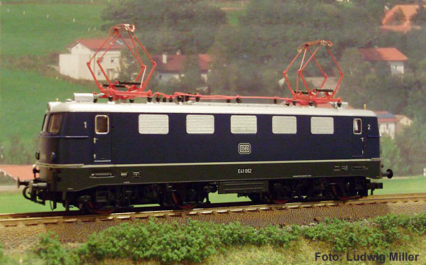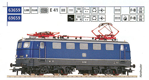 Im Rahmen des wiedererstandenen Roco Clubs wurde auf das Jubiläum “50 Jahre E41 in Deutschland” hingewiesen. Zu diesem (vielleicht etwas gekünstelten - aber es brachte eine neue E41...) Jubiläum wurden die Roco Club MItglieder mit einer Sonderauflage der E41 bedacht. In Gleich- und Wechselstrom fand man eine als E41 062 beschriftete Epoche III Version im Prospekt. Die blaue Lok wurde mit waagrechten Lüftergittern versehen, besaß keine Maschinenraumfenster und war damit eine weitere, bisher nicht gefertigte Ausführung. Vorbestellfrist war der 31.05.2006, erschienen ist das Modell dann im Herbst 2006. |