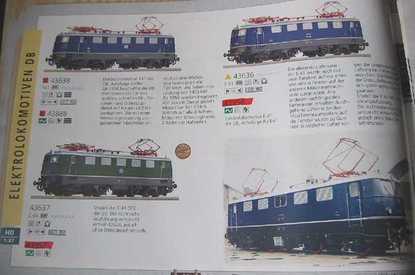 Die blaue Gleichstrom E41 erhielt im Katalog 1993/94 bereits die Kennzeichnung als Auslaufmodell, was aber ihrer weiteren Anwesenheit im Katalog keinen Abbruch tat. Vielleicht war es auch nur ein Fehler von Roco, hier diese Kennzeichnung anzubringen, die dann über Jahre bei dem Modell stehen blieb. Aber egal, die Roco E41 (43636) kann dafür für sich in Anspruch nehmen, dass sie vmtl. das Roco Modell mit der längsten “Auslaufmodell-Phase” gewesen ist. Zumindest war sie länger als Auslaufmodell im Katalog zu finden, als im normalen Programm. Auch ein Rekord, der zum Schmunzeln einlädt. |