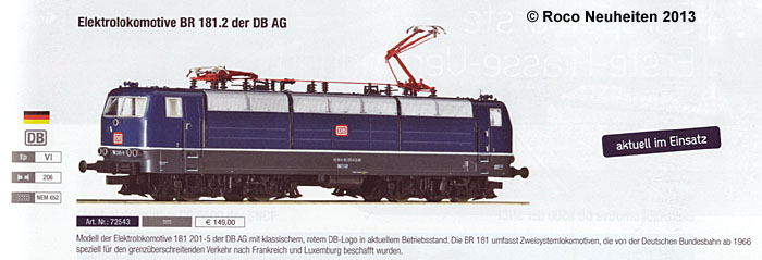 So kam als Neuheit 2013 das Modell in der Epoche VI-Version mit der langen Betriebsnummer in das Programm. Tatsächlich war die gezeigte 181 201-5 als auserwählte Museumslok in der blauen Lackierung mit dem modernen, roten DB-Logo aktuell im Einsatz und erfreute als einer der letzten Farbflecken im verkehrsroten Einerlei den Vorbildfreund. Das Modell wurde nur in Gleichstrom zum Preis von 149 EUR angekündigt und erschien 10/2013. |