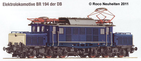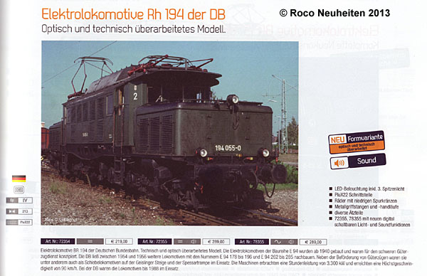 Das Neuheitenprospekt von 2013 brachte dann eine kleine Überraschung, denn auch die Roco 194 erfuhr nun eine Neuauflage. So wurde das Modell technisch und optisch überarbeitet angekündigt. Einige der beabsichtigten Änderungen wurden bereits genannt: LED Beleuchtung und diese auch (endlich) beim 3. Spitzenlicht, PluX22 Schnittstelle, Räder mit niedrigen Spurkränzen, Griffstangen und Handläufe aus Metall, diverse Ätzteile. Angekündigt wurde das Modell mit einem Vorbildfoto der 194 055-0 in DC, DC mit Sound und AC mit Sound. Damit war eine neue Basis für viele weitere Versionen gelegt. |