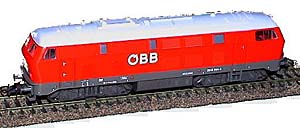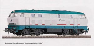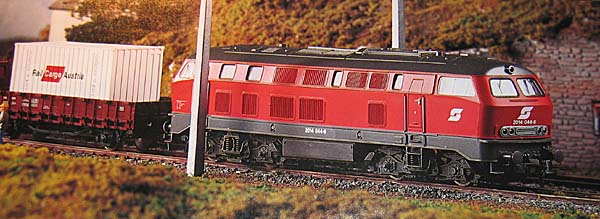 Neben den bereits beschriebenen Farb- und Beschriftungsvarianten der DB 215 hat Roco ab ca. 2000 das Modell auch dazu genützt, es in Anfangspackungen für andere Länder sozusagen “angepasst” anzubieten. Das erste Erscheinen einer 215 in fremden Farben kann ich mit 2000/2001 beziffern, als im Prospekt “Österreichische Sonderserien” als Neuheit eine Zugpackung 41155 mit einer ÖBB 2014 044-8 auftauchte. Die Betriebsnummer war natürlich rein fiktiv, das Modell aber in verkehrsrot/grau durchaus zutreffend lackiert. |