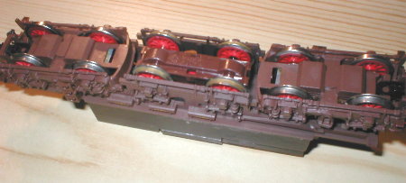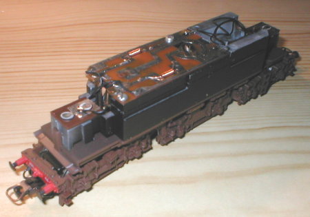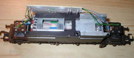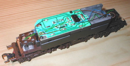 Modellpflege auch innen. Die neuen Ausführungen der Lok haben den schräggenuteten 5-poligen Motor eingebaut und besitzen eine NEM-Schnittstelle auf der Platine. Platz für den Decoder ist ausreichend vorhanden. |