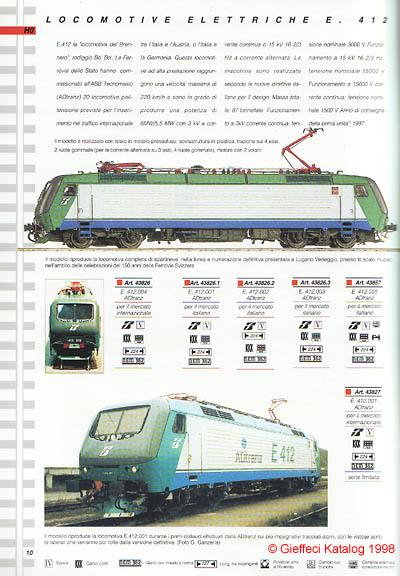 die E412 ein und dies gleich gewaltig. So zeigte der Gieffeci Katalog vom Januar 1998 gleich mehrere Ausführungen des Modells: So wurden dort als Neuheiten angekündigt: