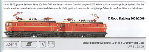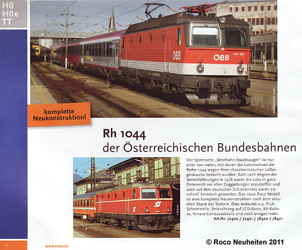 Im Katalog Herbst/Winter 2010 war neben dieser 1044 zudem unter der Bestellnummer 61412 ein Zugset “Eilzug der ÖBB” zu finden. Darin waren drei lange Schlierenwagen zu finden und, man glaubt es kaum, wieder ein Modell der 1044 501-3. Noch vor dem Erscheinen wurde dies in Foren kontrovers diskutiert. Die einen freuten sich, nun endlich zu einem (relativ) normalen Preis die 1044 501 zu erhalten, die anderen sahen den Wertverlust ihres alten Modells und verdammten die Entscheidung von Roco, denn die 1044 501 war bisher eines der wenigen Rocomodelle, die tatsächlich einen Sammlerwert erreicht hatten. |