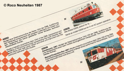 Weitere Modelle folgten. Es scheint fast so, als hätte es Roco selber Spaß gemacht, laufend neue Versionen zu fertigen, denn eine solche Vielfalt an Modellen hat es sonst fast nirgendwo gegeben. Aber zurück zu den nächsten Versionen: Im Jahr 1994 erschien als zweite Auflage der 43658 mit der 1044 094-9 eine weitere Betriebsnummer. Und eine weitere Neuerung wurde angekündigt und zwar die 1044 006-3 (43720). Mit einem neu konstruierten Gehäuse erschien wieder ein Modell mit den Lüftergittern in der Dachkante (erschienen kurz vor Weihnachten 1994). Auch dieses Modell wurde wieder, wie einige der Vorgänger, in Wechselstrom angeboten. Die 1044 056-8 in rot/grau beendete als österreichische Sonderserie den Reigen der neuen Versionen 1994. |