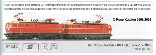 Im Katalog Herbst/Winter 2010 war neben dieser 1044 zudem unter der Bestellnummer 61412 ein Zugset “Eilzug der ÖBB” zu finden. Darin waren drei lange Schlierenwagen zu finden und, man glaubt es kaum, wieder ein Modell der 1044 501-3. Noch vor dem Erscheinen wurde dies in Foren kontrovers diskutiert. Die einen freuten sich, nun endlich zu einem (relativ) normalen Preis die 1044 501 zu erhalten, die anderen sahen den Wertverlust ihres alten Modells und verdammten die Entscheidung von Roco, denn die 1044 501 war bisher eines der wenigen Rocomodelle, die tatsächlich einen Sammlerwert erreicht hatten. |