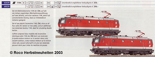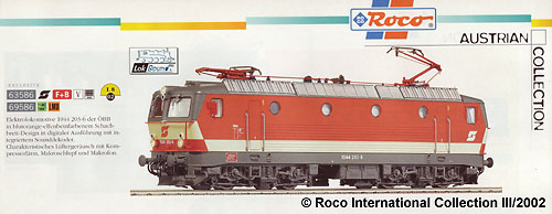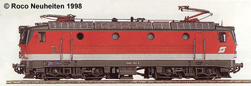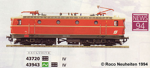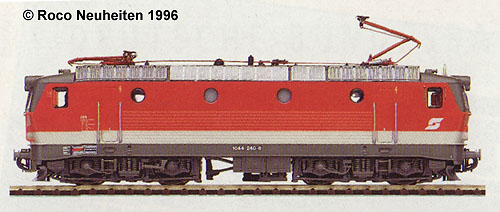 Weitere Modelle folgten. Es scheint fast so, als hätte es Roco selber Spaß gemacht, laufend neue Versionen zu fertigen, denn eine solche Vielfalt an Modellen hat es sonst fast nirgendwo gegeben. Aber zurück zu den nächsten Versionen: Im Jahr 1994 erschien als zweite Auflage der 43658 mit der 1044 094-9 eine weitere Betriebsnummer. Und eine weitere Neuerung wurde angekündigt und zwar die 1044 006-3 (43720). Mit einem neu konstruierten Gehäuse erschien wieder ein Modell mit den Lüftergittern in der Dachkante (erschienen kurz vor Weihnachten 1994). Auch dieses Modell wurde wieder, wie einige der Vorgänger, in Wechselstrom angeboten. Die 1044 056-8 in rot/grau beendete als österreichische Sonderserie den Reigen der neuen Versionen 1994. |