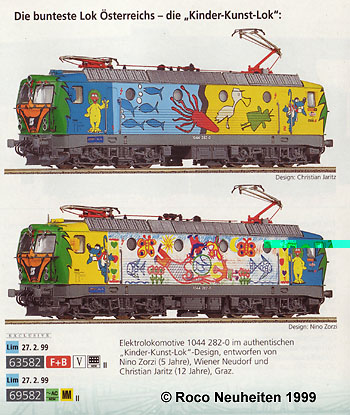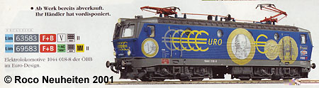 Dieser Weg, als großer Modelleisenbahnhersteller auch für einen guten Zweck tätig zu werden, wurde dann auch mit dem nächsten Modell einer 1044er fortgesetzt. Bereits im Neuheitenprospekt 2000 wurde eine “Eurolok” (zur Einführung des Euro ab dem 01.01.2001) angekündigt, deren Lackierung noch nicht bekannt gegeben wurde und das Modell war daher in weiß mit einem großen Fragezeichen abgebildet. Auch hier wurde wieder von dem Kaufpreis jeder Lok eine Spende in Höhe von 150 öS / 21,50 DM / 10,90 EUR an Licht ins Dunkel überwiesen. |