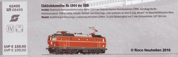 Auch der Neuheitenprospekt von 2010 beinhaltete eine weitere 1044. Diesmal war es wieder eine 1044 im klassischen Orange und mit dem “Pflatsch” als Logo. Die abgebildete Lok zeigte hohe Lüfter und das Dach und den Rahmen in Umbra. Zudem trug die Lok noch die frühere, nicht computergerechte Loknummer 1044.115. |