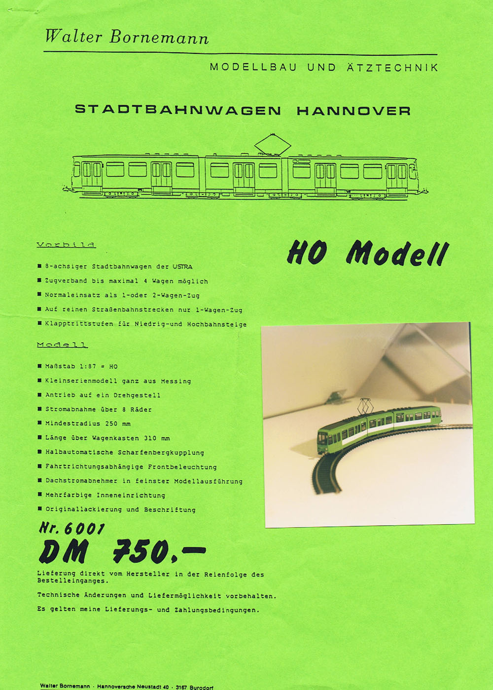 wurde. Das Modell von Bornemann war die erste Nachbildung dieser formschönen Stadtbahn. Später folgten Modelle u. a. von MSE, Wumm und Halling. Auch einen Bausatz von Schwarz (Schwarze Schäfchen Bahn) gab es, der