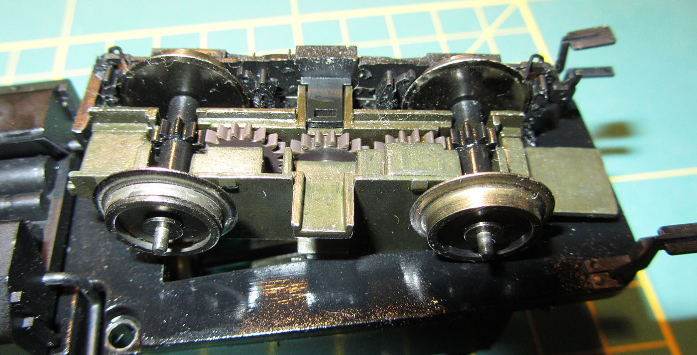 Schnecken-/Stirnradgetriebe alle vier Achsen an (bei der AC-Version, die ich hier zeige, sind es 3 Achsen). Dei AC-Version besitzt auf einem Drehgestell 2 Haftreifen. Die Stromabnahme erfolgt von allen Rädern