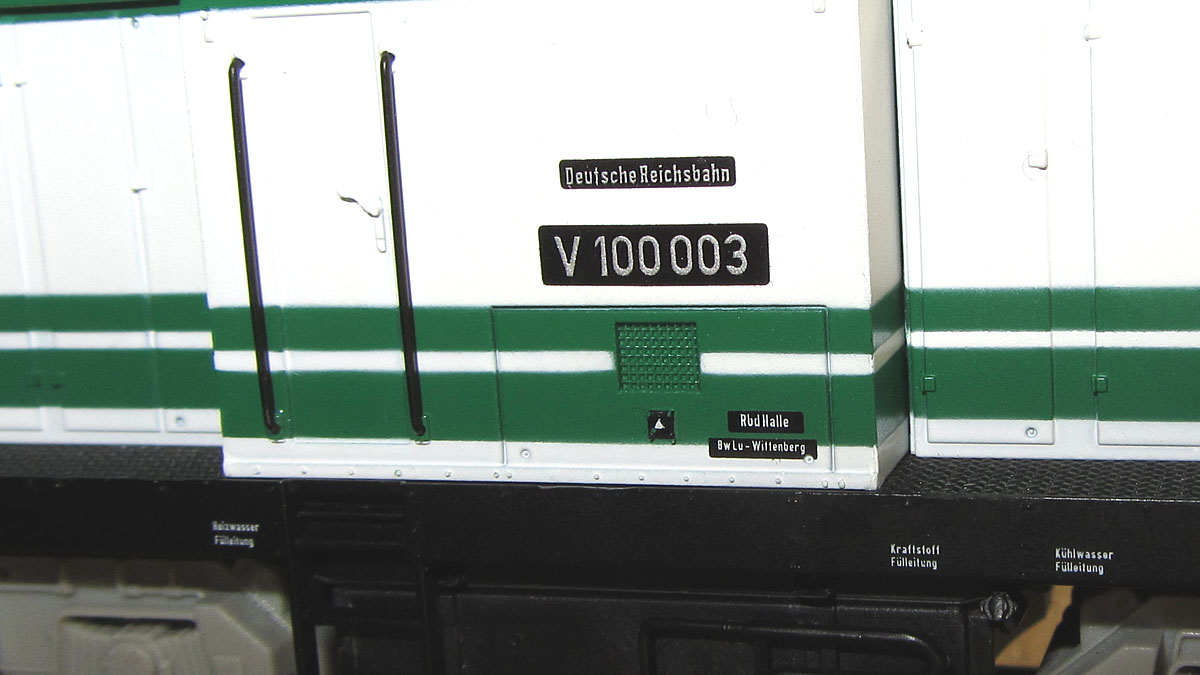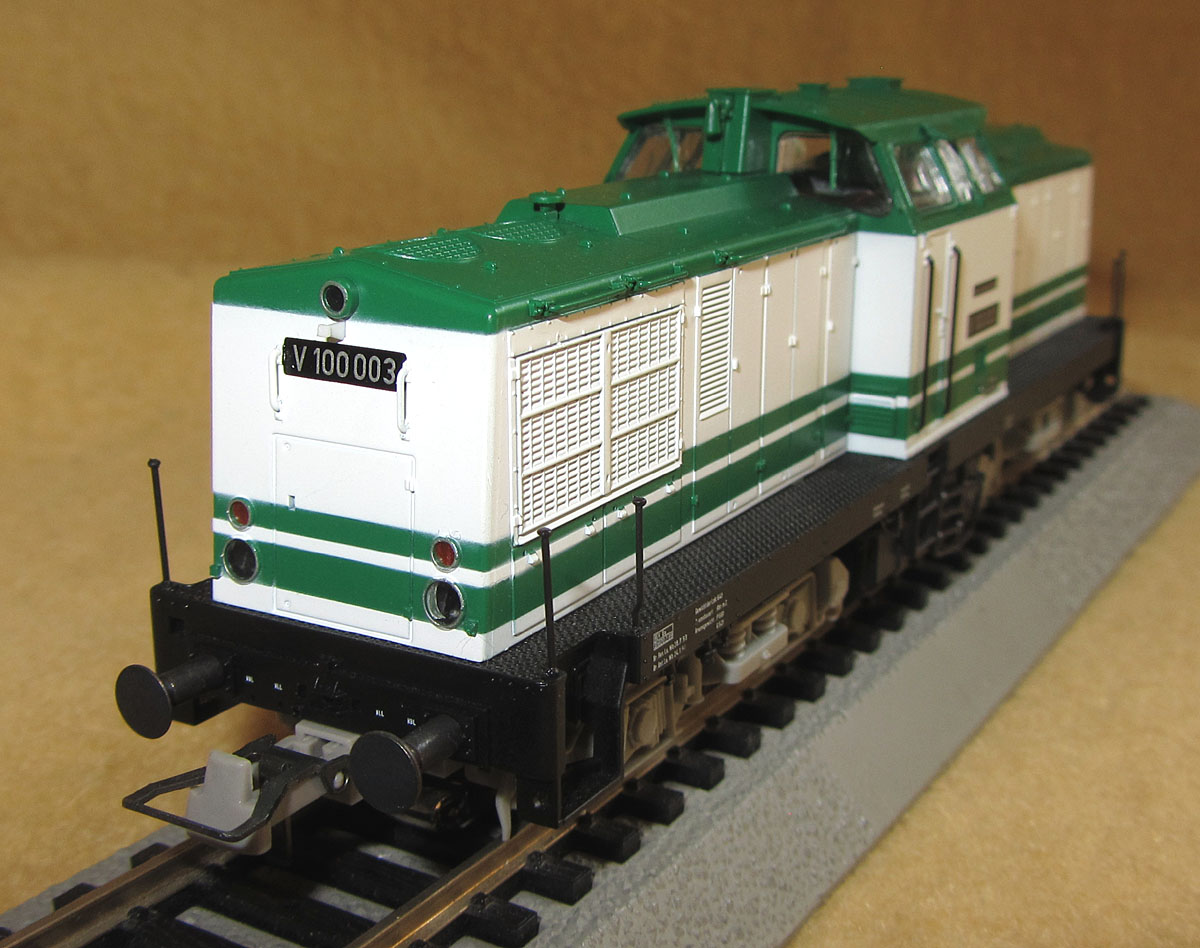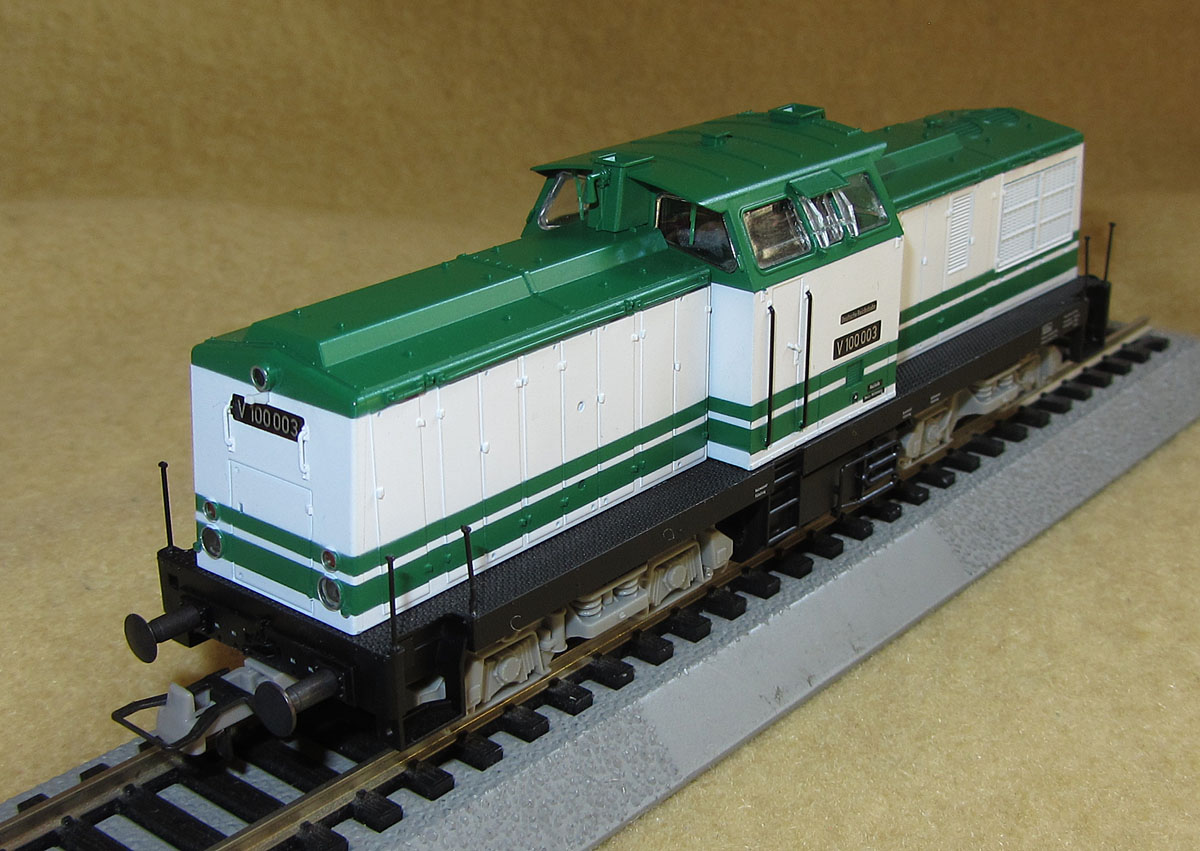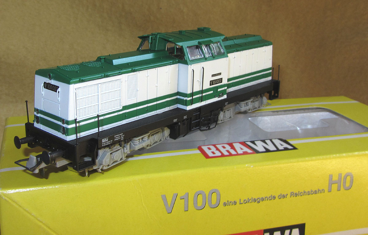 Reichsbahn, die erstmals 1964 vorgestellt wurde. Die V100 003, die Brawa nachgebildet hat, wurde im Jahr 1966 auf der Leipziger Frühjahrsmesse in einer weiß/grünen Messelackierung gezeigt (es ist auch von