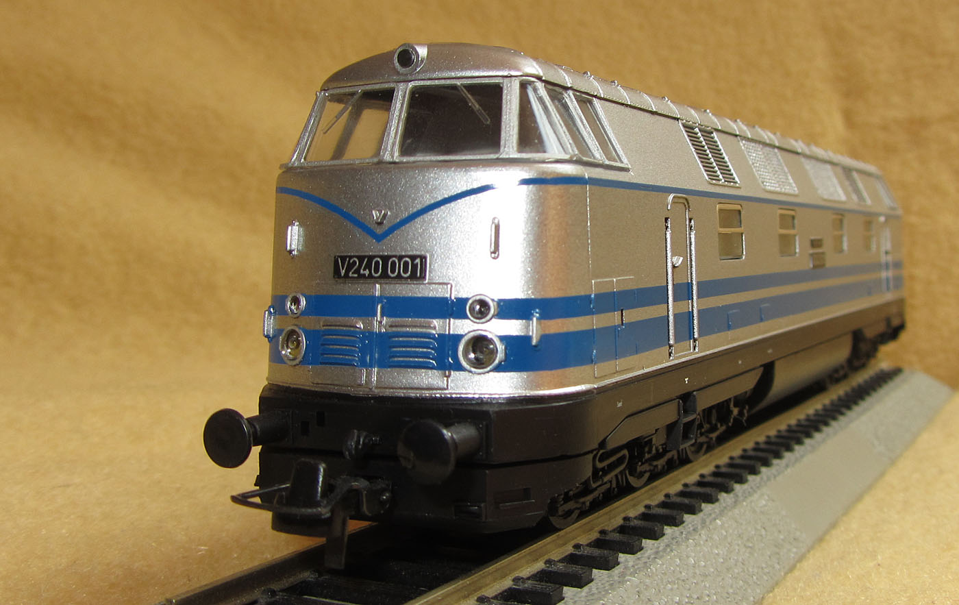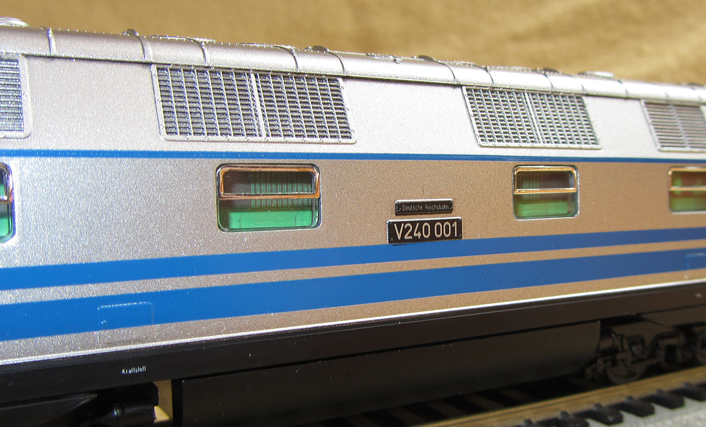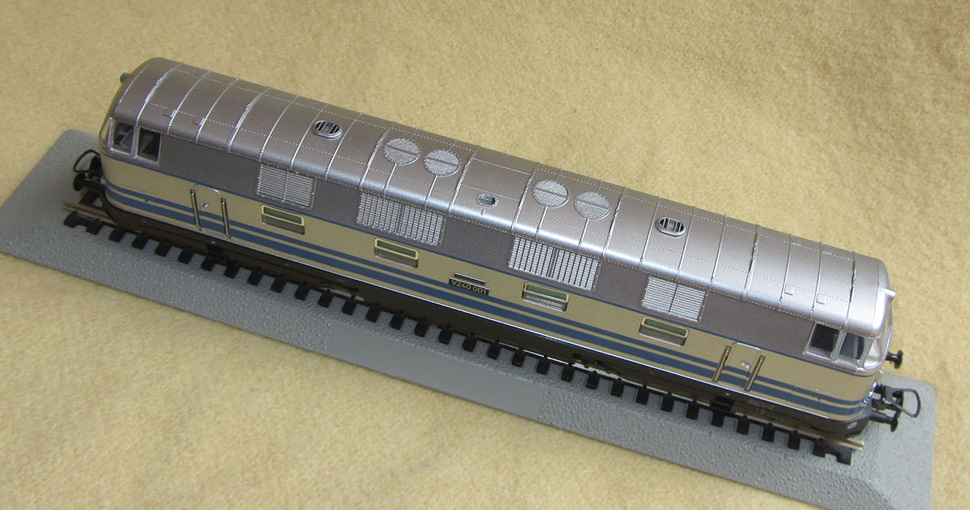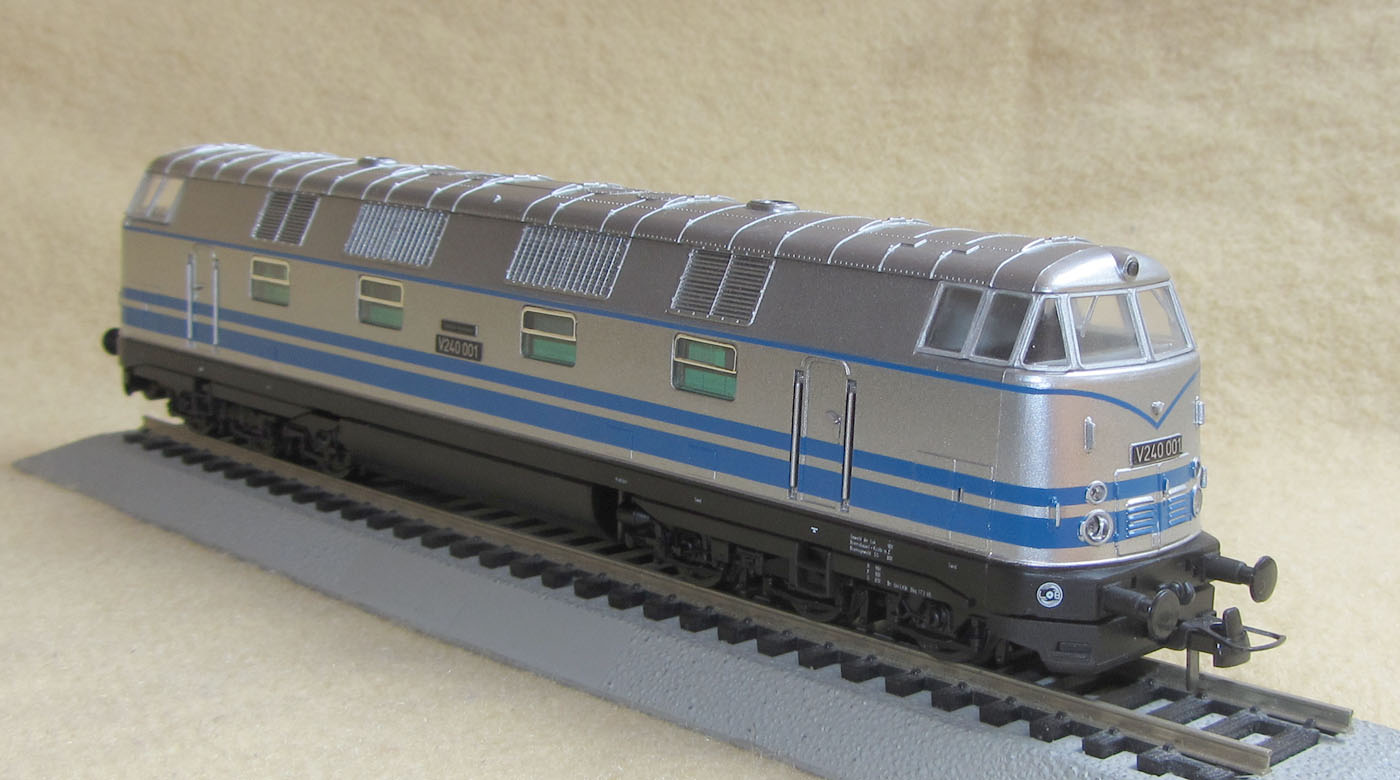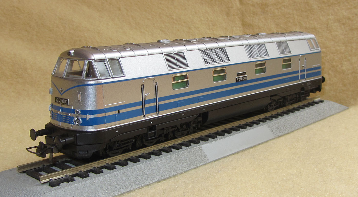 Mit der Sonderlackierung in Silber mit blauen Zierstreifen war die V240 001 ein