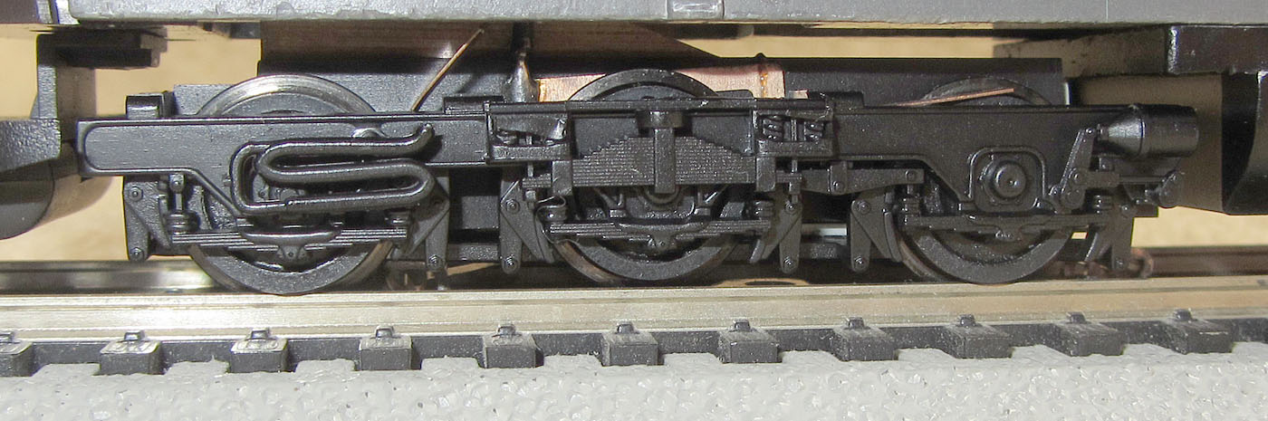 Wenn man das Modell von unten betrachtet, dann fallen einen vor den Drehgestellen,