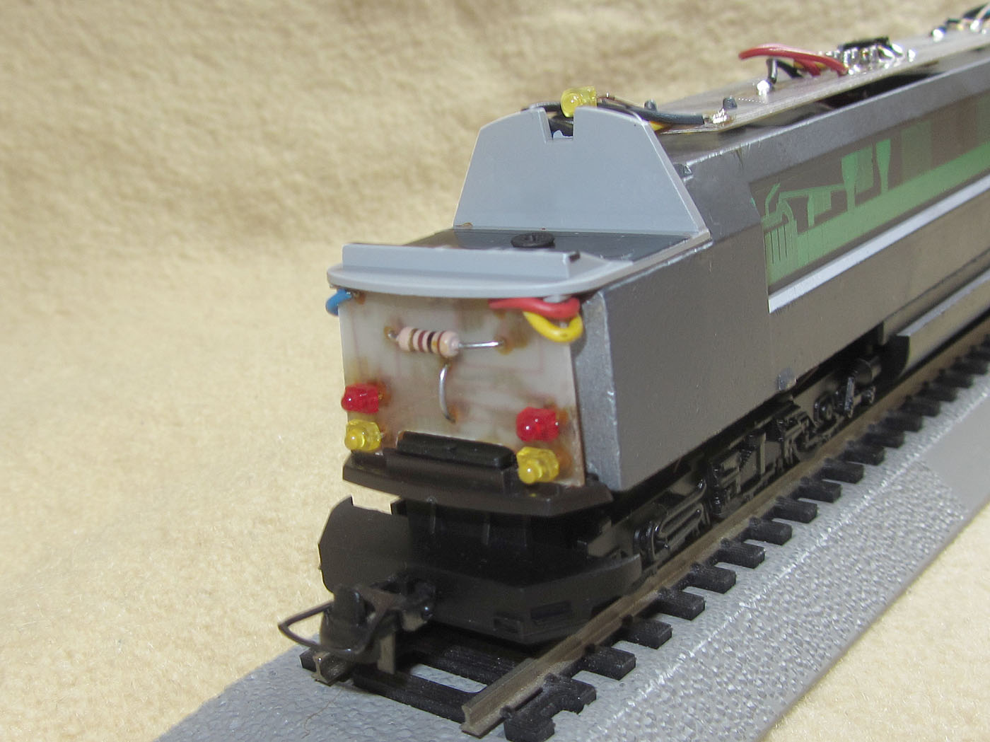 vorderen und hinteren Räder der beiden Drehgestelle drücken. Bei der AC-Version kommt der Mittelschleifer dazu und hier sind die Schleiferbleche des vorderen Radsatzes ((Schleiferdrehgestell) nach oben gebogen, da