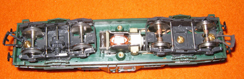 er über einen Gumiring eine Längswelle im Gehäuse an, welche dann über eine doppelte Umlenkung die beiden Achsen eines Drehgestells antreibt. Klingt kompliziert, funktioniert aber und auf den Fotos wird es
