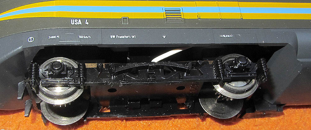 Messingschwungmasse. Er treibt mittels Kardanwelle und Stirnrad-/Schneckengetriebe die beiden Achsen des vorderen Drehgestells an. Alle vier Räder dieses Drehgestells tragen Haftreifen. Beim Wechselstrommodell