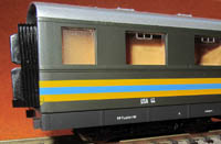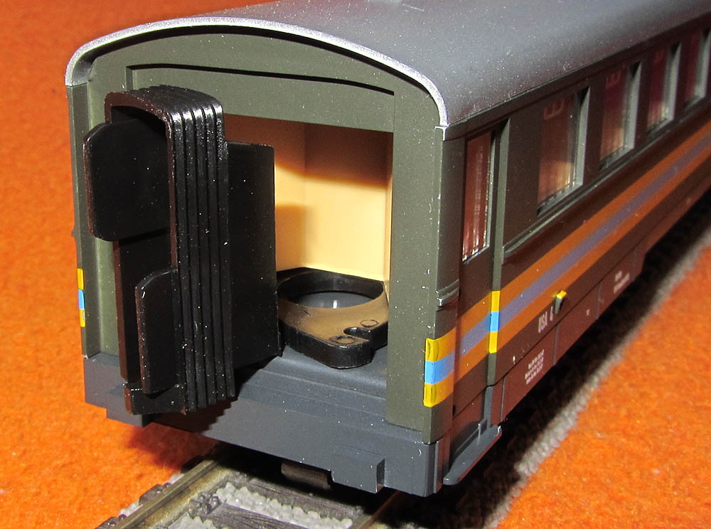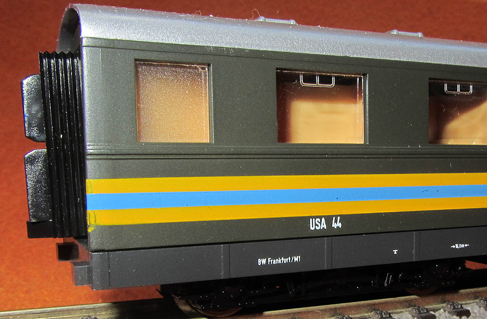 dem Rahmen und greifen von hinten in den Wagenkasten, bzw. die dortigen Fenstereinsätze. Hier sind es je Seite drei Rastungen, nämlich auf Höhe des ersten Seitenfensters, der mittleren Türe und des letzten Fensters.
