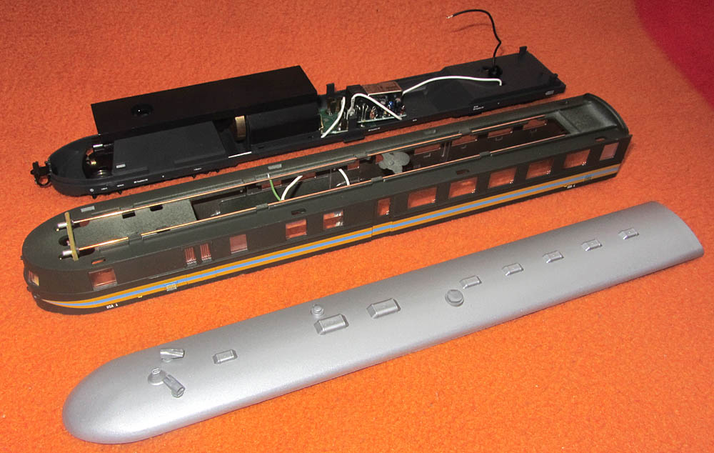 4 Stück) auf dem Wagenkasten gehalten. Zweckmäßig ist es, über der mittleren Einstiegstüre vorsichtig den Fingernagel zwischen Dach und Wagenkasten zu schieben und sich dann auf einer Seite langsam zu den