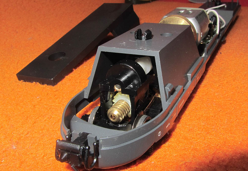 Fahrzeugteil sorgt ein Gussblock, der über den Motor und das angetriebene Drehgestell gesetzt wurde. Der angetriebene Teil wiegt ca. 240 Gramm, die nicht angetriebenen Teile ca. 130 Gramm.