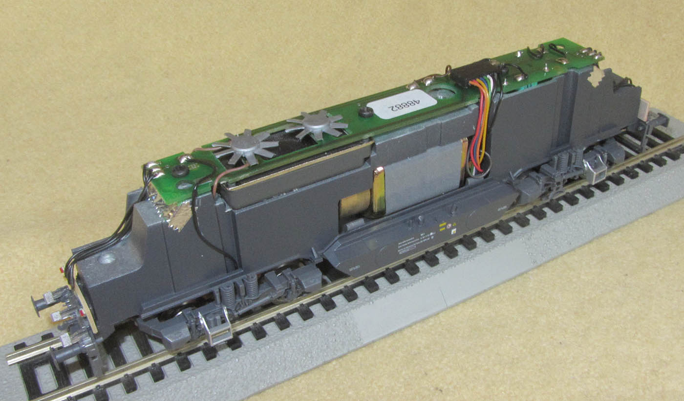 und dann kann das Gehäuse mit Rahmen, ggf. mit leichtem Schütteln, nach oben abgenommen werden. Es gibt sonst keine weiteren Rastnasen. Beim Umdrehen der geöffneten Lok bitte auf die Ventilatoren achten, die sind