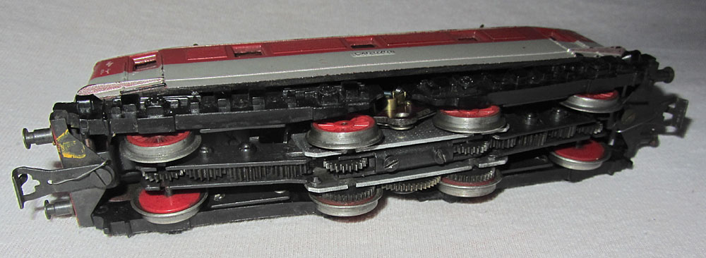 angefangen. Inzwischen bekam ich den Tipp, wie ein Zerlegen der Lok leichter ist. Wenn man die Lok auf das Dach legt, kann man von unten erkennen, dass in der Mitte das Drehgestell an einem kleinen Stift hängt und