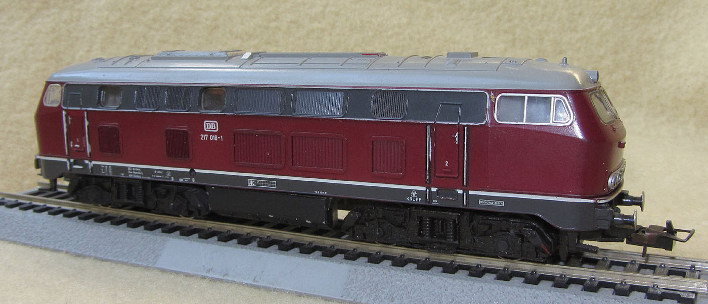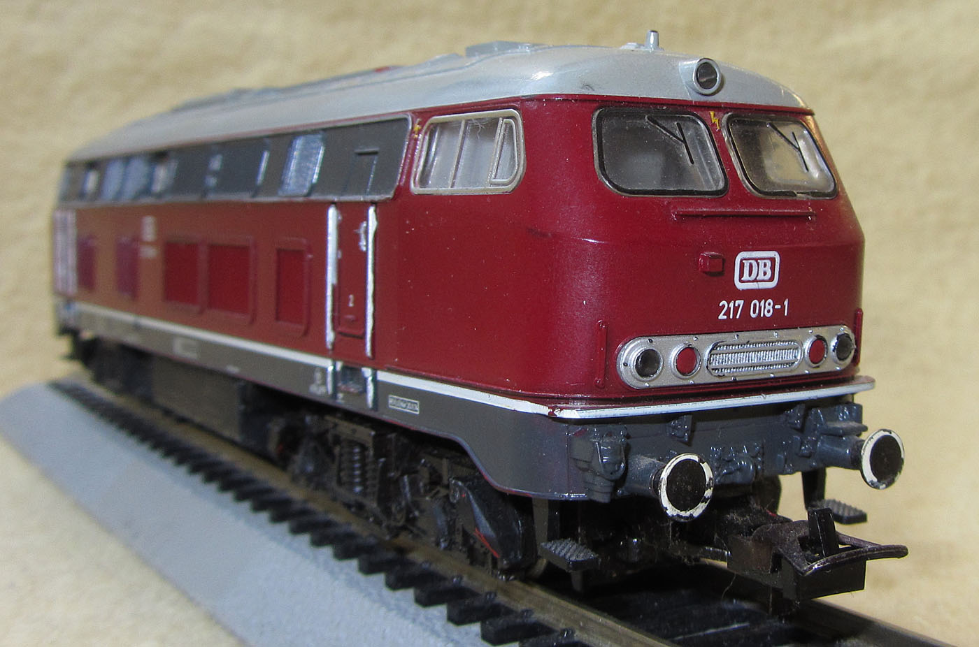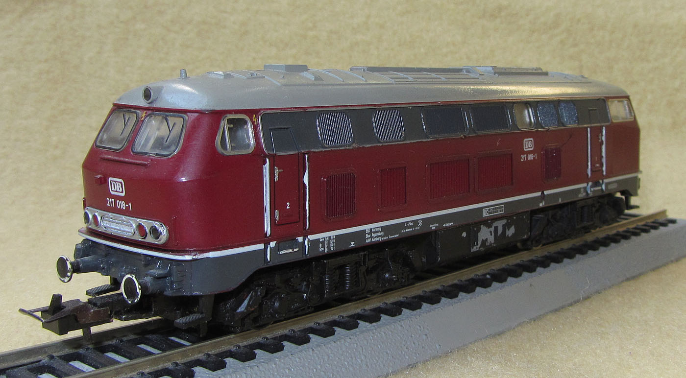217 in Gleichstrom, bei der nicht nur ein Puffer, sondern auch auf dem Dach der Auspuff der Heizanlage fehlt. Ich bin mir auch nicht sicher, ob die Verkabelung so original war. Zur Darstellung des Modells als