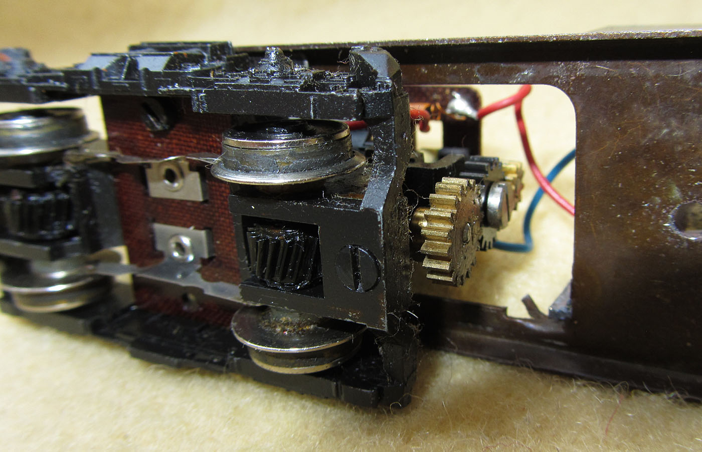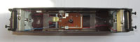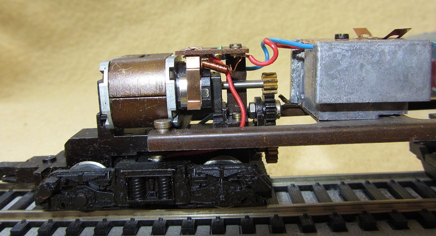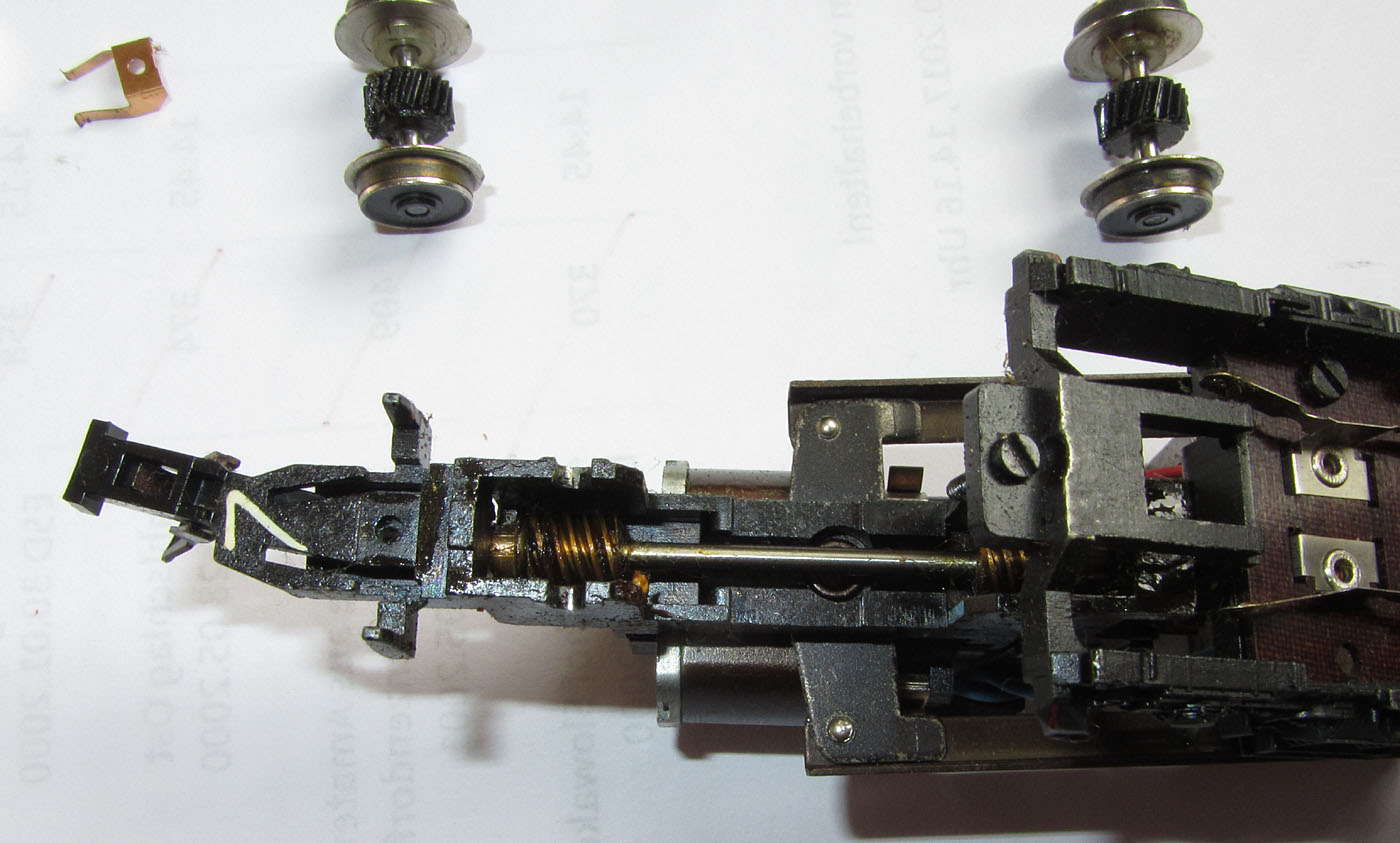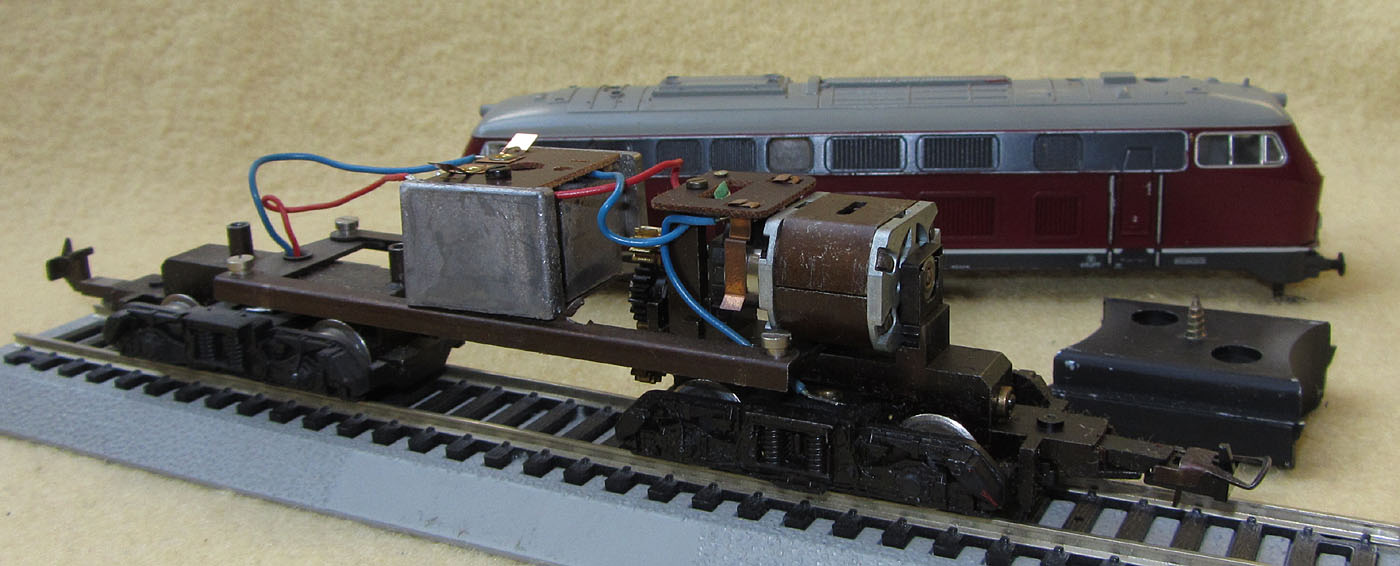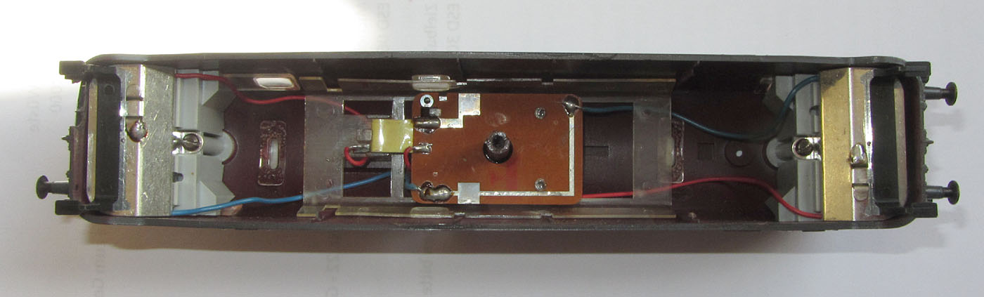 Haftreifen. Zur Stromabnahme werden alle 8 Räder mit Schleifern von der Hinterseite herangezogen. Zwei Kontaktbleche auf dem mittleren Gussgewicht sorgen für die Verbindung zu einer Platine im Dachbereich, welche
